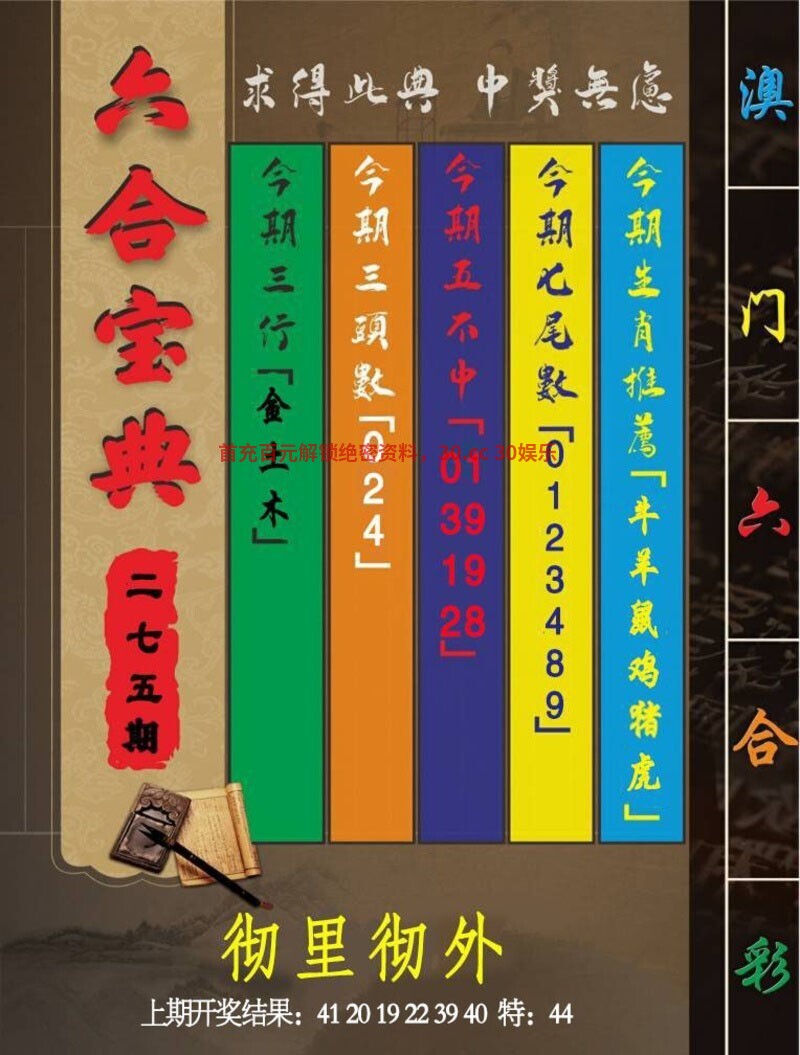 275期六合宝典《彻里彻外》 ①图解特肖:牛羊鼠鸡猪虎 ③四码不中:01.39.19.28 |